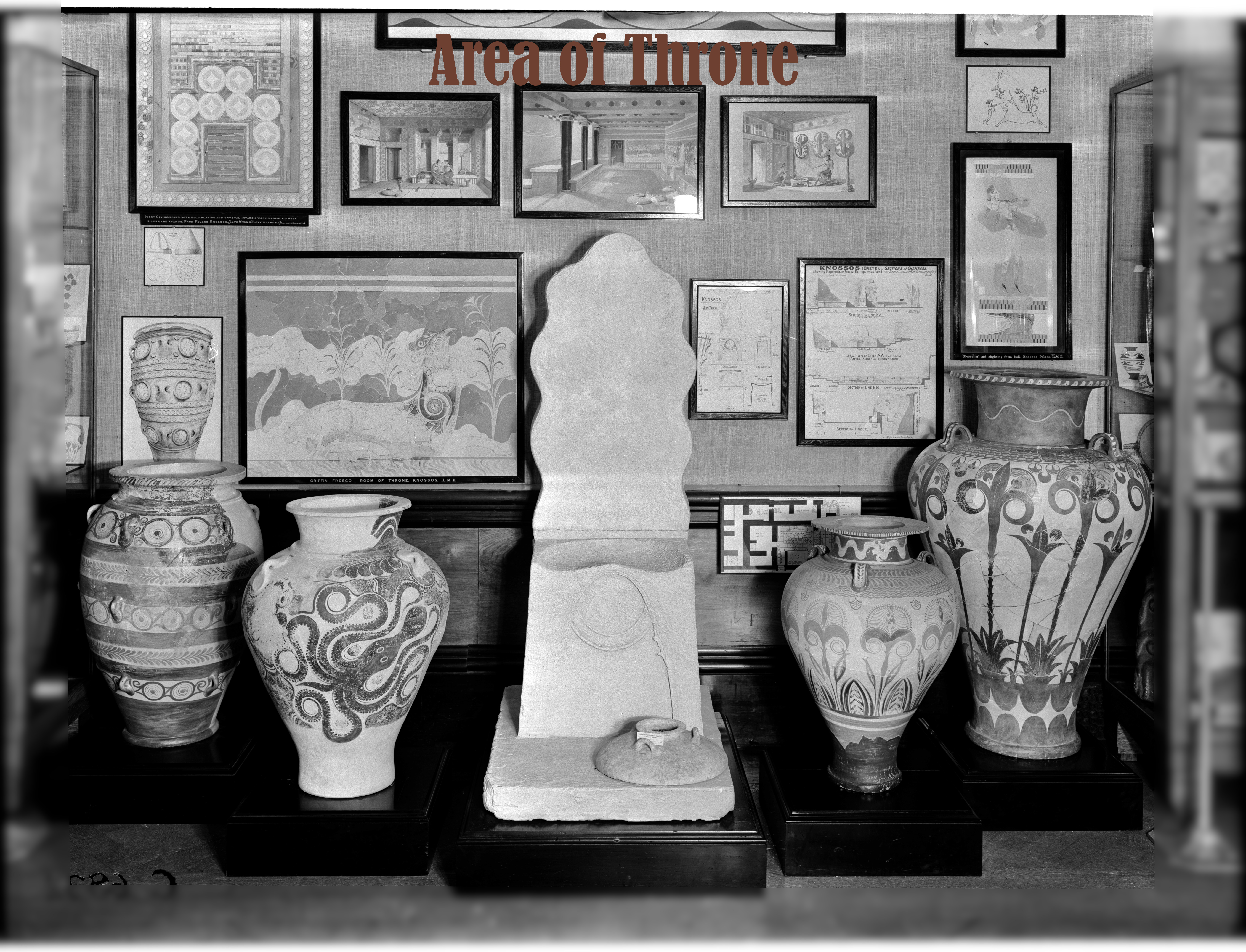 It is possible some of these framed labels were included on the wall displays, but are not visible in the photograph: ‘Cult Scenes on Agia Triadha Sarcophagus’, ‘Spring Chamber and Niche by Caravanserai’, ‘Plan of South Hall of South Propylaeum’, and ‘Elevation of West Bastions of North Entrance Passage’.