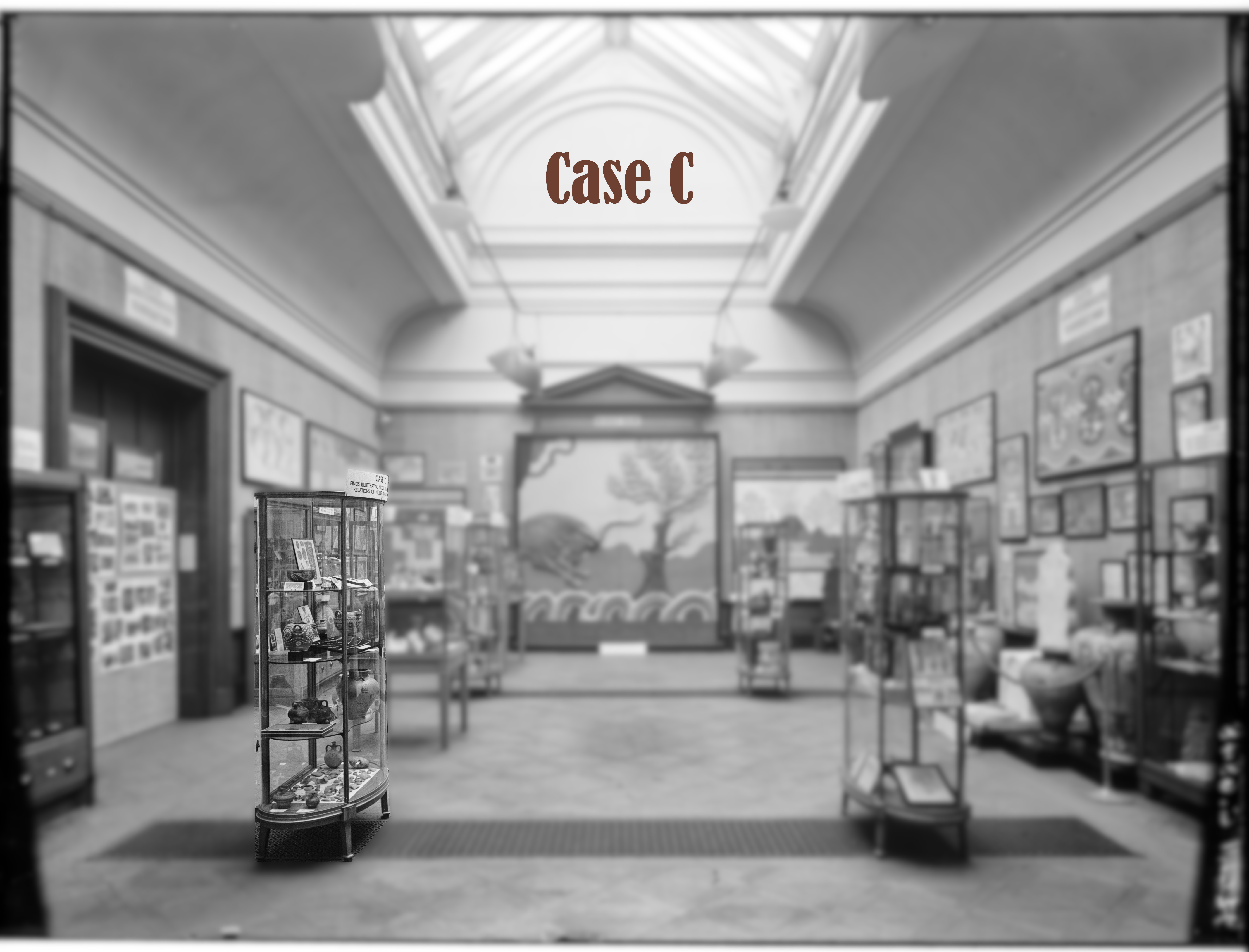 Wall Case B was located on the same wall as Case A, but it is barely visible in the photograph. Only through the glass of Case C can a few objects and labels be seen. The case was dedicated to the Early Minoan III to Middle Minoan IIB periods (2400–1700 BCE). It contained a great deal of pottery in a variety of styles (i.e., ‘barnacle ware’, ‘barbotine ware’, monochrome, polychrome, etc.), but it is difficult to identify the specific pieces on display. Some objects listed in the printed catalogue are discernible: two vessels (an Early Minoan III spouted pot and a jar with triple group of palm trees) and two other artefacts (Gypsum Round Table and facsimile of Mallia Bee Pendant). Although not mentioned in the printed catalogue, in the photograph a votive ‘cow-bell’ and ‘barbotine’ ware cup, are visible on the upper shelf. Several exhibition labels match descriptions in the printed catalogue. The exhibition labels ‘Wall Pattern Nature Printed with Small Sponge on Stick’ (see below) and ‘Silver Vase and Ceramic Imitations of Metal Forms’ are barely visible on the middle shelf of the case. It is possible that several other exhibition labels related to Early Minoan III to Middle Minoan IIB were displayed in this case: ‘Seal from Agia Triadha and Jug from Kamares Cave’, 'MM IA Pottery from House A and B Beneath Koulouras’, ‘Vessel for Filtering’, and ‘Floral Patterns of a Textile Character on MM IB Pottery’. The labels ‘MM II Polychrome Vases Illustrating Earlier Palace Style’, ‘Rhytons in the Form of Bulls with Acrobatic Figures’, ‘Bronze Daggers from Tholos at Hagia Triada’, ‘Clay Idols Showing MM I Skirts’, ‘Vat Room Deposit Materials’, and ‘EM III Larnakes’ were possibly in the case as well. Labels ‘Griffins’, ‘Lintels of Mycenae and Kumasa’, ‘Primitive Beehive Tombs’ may have been either Case A or Case B.