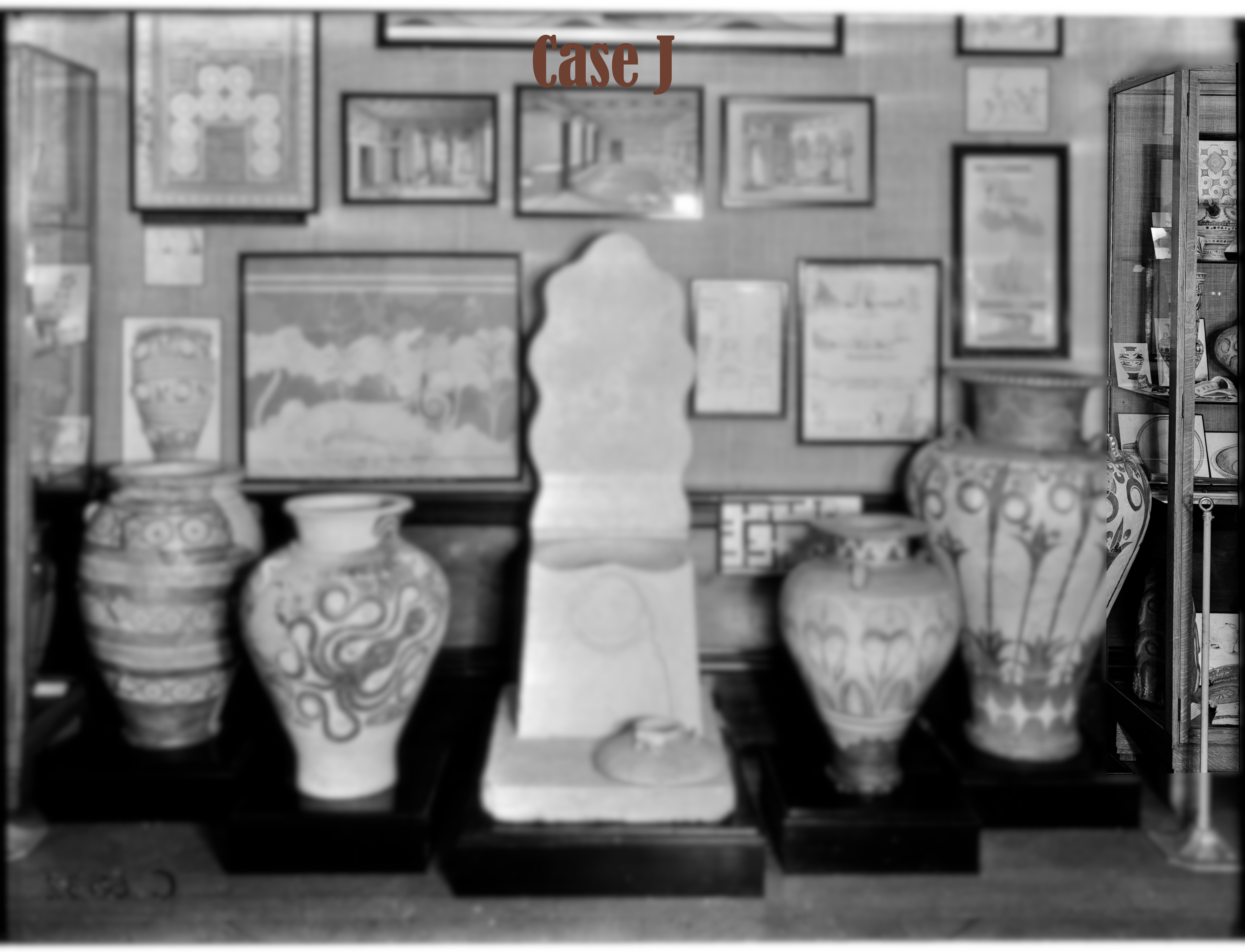 The following exhibition labels may have also been included within Case J or on the wall to the right of it: ‘Zakro Marine Style Rhyton’, ‘Dagger Blade with Inlaid Cats hunting ducks’, ‘Ewers from Knossos and Mycenae’, ‘Amphora from North West Palace Border’, ‘Jars of the Palace Style’, ‘Temple Tomb Assemblage’, ‘Hoard of Bronze Vessels from Stepped Portico’, ‘Remains of Bronze Rapiers’, ‘Pithoid Amphora from Senmut Tomb in Thebes’, ‘Marseilles Ewer’, ‘Amphora from Royal Villa’, ‘Inlaid Design of Swimmers on Dagger Blade’, ‘Inlaid Design on Mycenae Dagger Blade, Cats Hunting Ducks’, ‘Development of Design on Steatite Rhyton from Knossos, The Ambushed Octopus’, ‘Bronze Dagger with Boar’, ‘Bronze Halberd Blade’, ‘Birds in Late Revival’, and ‘Painted Clay Sarcophagus or Larnax from Anoia’, and ‘Contents of Egyptian Grave of Thothmes III’s time at Sakkara’.