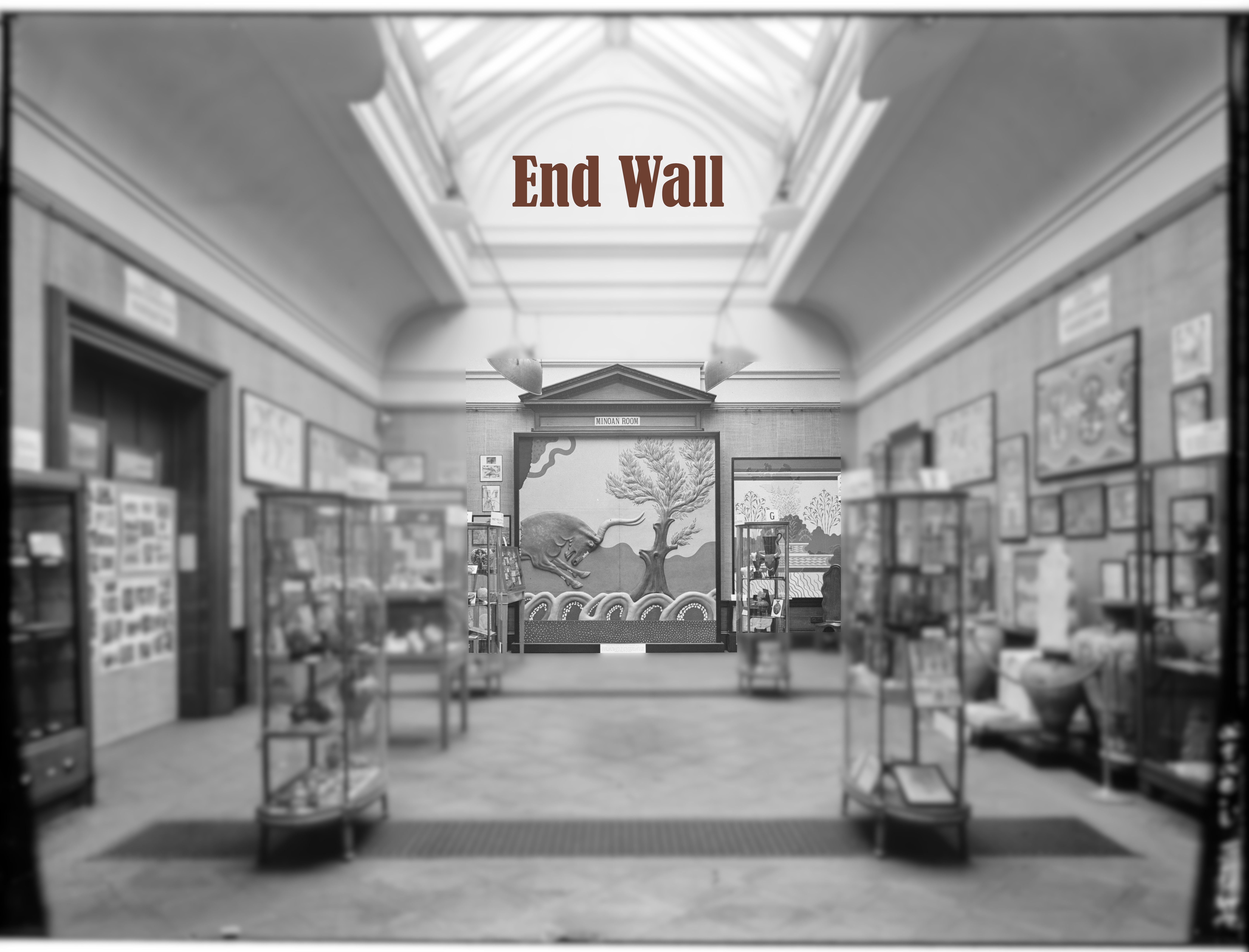 On the wall surrounding Case B several fresco copies were displayed. It is possible to see the large Ladies in Blue fresco and the Partridge Frieze from the Caravanserai on the upper part of the wall. Through the glass of Case C and B other framed frescoes are visible, probably including those mentioned in the printed catalogue: Child Putting Saffron Flowers in Baskets, Spiral Frescoes, the Miniature Frescoes (Sacred Grove and Dance, and the Temple and Grand Stand), Blue Monkey in rocky landscape with ‘sacral ivy’, and Blue Roller among rocks. In the printed catalogue it is recorded that the Charging Bull on a Crystal Plaque was on this wall, but rather it is visible (in a large frame like the other wall copies) on the lowest shelf of Case F in the immediate foreground. Two other fresco specimens from the House of the Frescoes are visible on the End Wall (Monkey Hunting Among Papyrus and another depicting a river—see ‘Specimens from House of Frescoes’) above the frescoed lily panel from Amnisos. The ‘Miniature Frescoes of Seated Ladies on Grand Stand’ may have hung on the wall as well. The rest of the wall illustrations, including the plaster Charging Bull, are discussed in a separate section below.